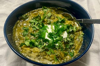 An almost-instant split pea soup with kale, celery, and scallion oil