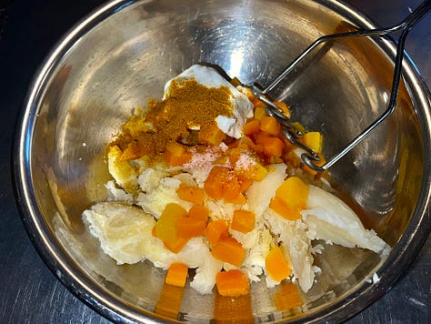 Combine potato innards, cooked butternut squash, yogurt, coconut oil, nutritional yeast, salt, and spices in a bowl. Mash until combined. (You can carefully use a stand mixer, but do not use a blender or food processor - the potatoes will become unpleasantly sticky.)