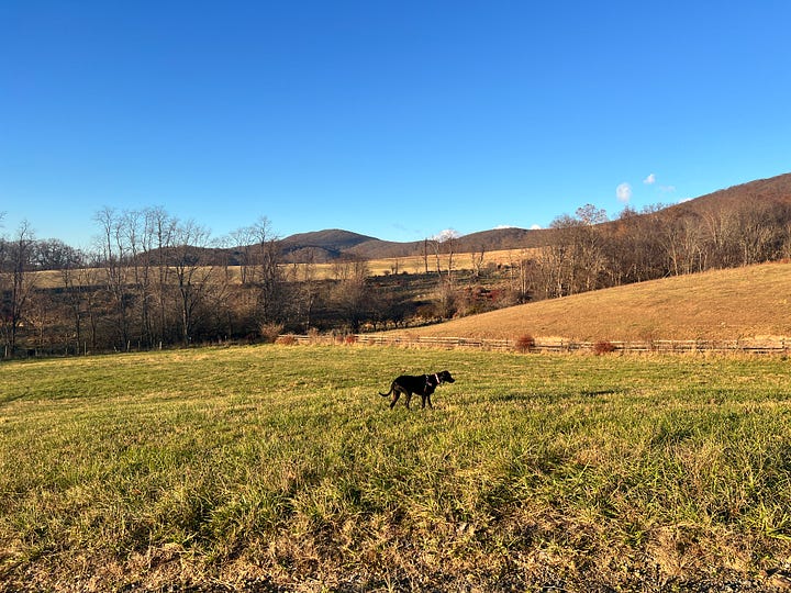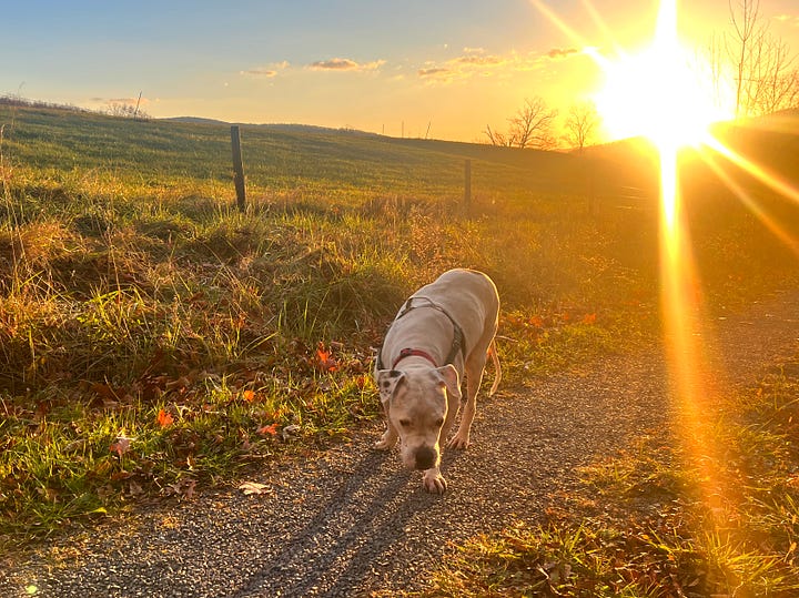 Panzer, our nearly 13-year-old man, has been with us for more than twelve, through three cross-country moves, multiple career changes, a global pandemic, and a final move out to the country. He has seen it all and mostly does only what he wants to. He’s at the life stage where you look at your humans with patient, Jedi eyes, no tricks needed to receive praise and rewards. Once a sprinter, he’s now much more inclined to take in the view from the comfort of the living-room sofa, in between naps. But he still likes to get outside and refresh the senses.