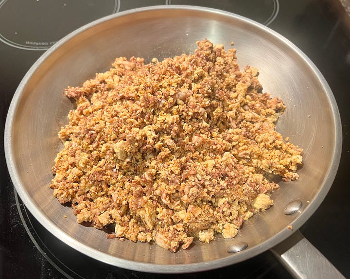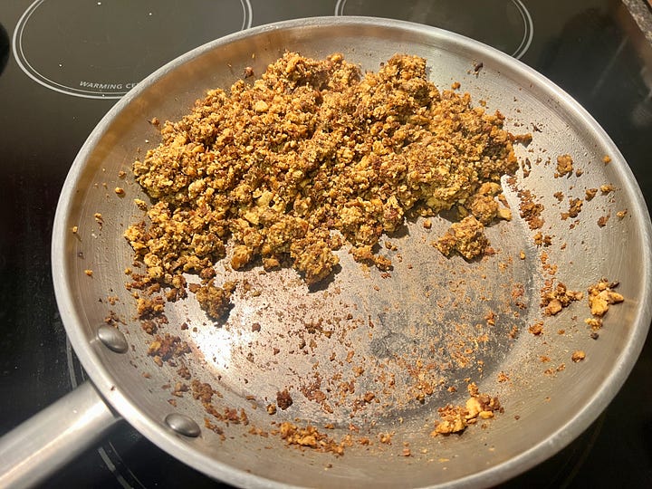 You’ll want to cook the mushrooms and tofu longer than you think. The volume will reduce by 1/2 to 2/3 and most of the water will cook off, leaving crumbles similar to the texture of ground meat.