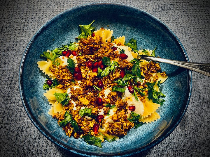 Assemble: begin with a layer of cooked pasta; add 1/4 of the yogurt mixture, then 1/4 of the tofu/mushroom mixture, then drizzle with paprika butter. Sprinkle with parsley and pomegranate seeds.